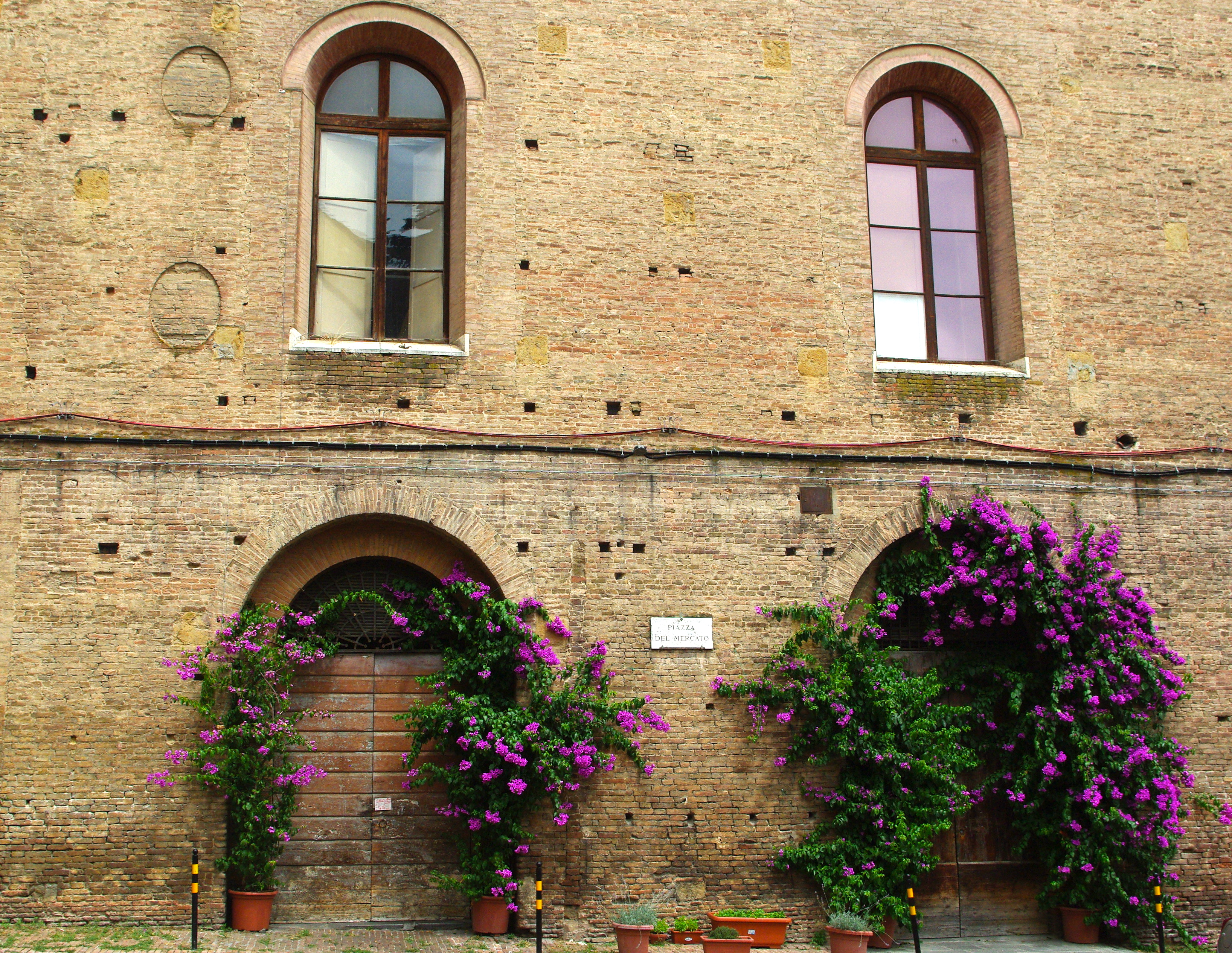 There’s something about symmetry – doors and windows, matching archways, those beautiful old bricks – and the bouganvillea: purple reflected in the upper window – colour contrasting with Dublin’s stark black and white and yet another language on the street sign. Love it.