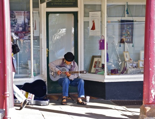 People pictures, Photography colour, guitar, hat, old man, pillars, reflection, street, summer, Totnes, window 4 Comments Sally Ann